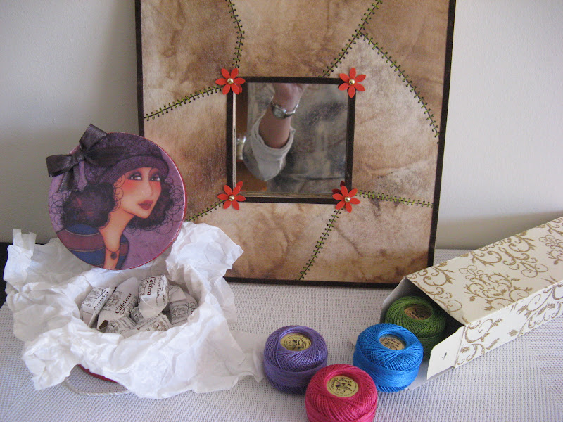 Un Malma fet amb la tècnica del fals cuir, que domina a la perfecció. Dintre una capseta ben decorada un carmels bonissims, i dintre una altre capseta no menys decorada uns fils preciosos, per fer les meves floretes, tal i com m"ha dit ella.