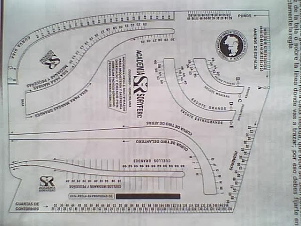 regla para modisteria. con tan solo unas medidas básicas la regla trabaja en proporciones anatómicas- por ejemplo 38cm ancho de espalda- con esta medida puedo trazar: cuellos-anchos espalda-escotes-sisas-puños-fundillo (tiro)-- ademas tiene los contornos simplificado- pues no necesitas de sacar cuentas .. tan solo ejemplo: contorno de cintura 70 cm entonces desde la punta inferior de la regla trazas 70 y ya.... es fácil