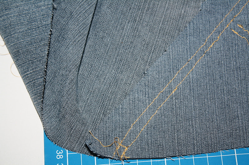 Ponéis alfileres, y lo coséis a máquina, respetando las marcas de los pespuntes del pantalón ""desvencijao"".