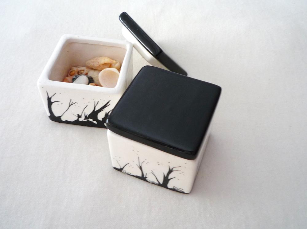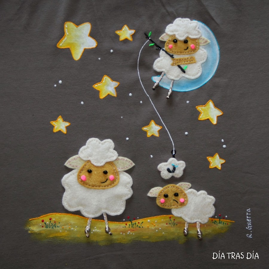 Almudena ha encontrado su hueco en este mundo haciendo elementos de cerámica pintada. Cuando conocí su trabajo, me hizo mucha gracia encontrar un modelo de conjunto de vajilla infantil que llevaba un dibujo que he usado algunas veces en mis camisetas. Seguro que os suena mi camiseta modelo ?Ovejitas en la luna?, ¿verdad? Aquí os refresco la memoria: