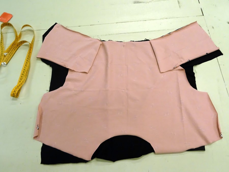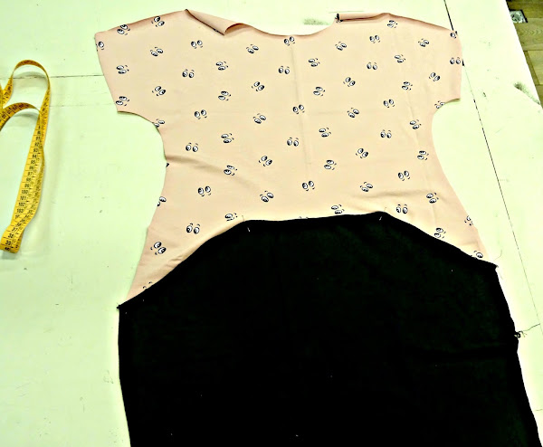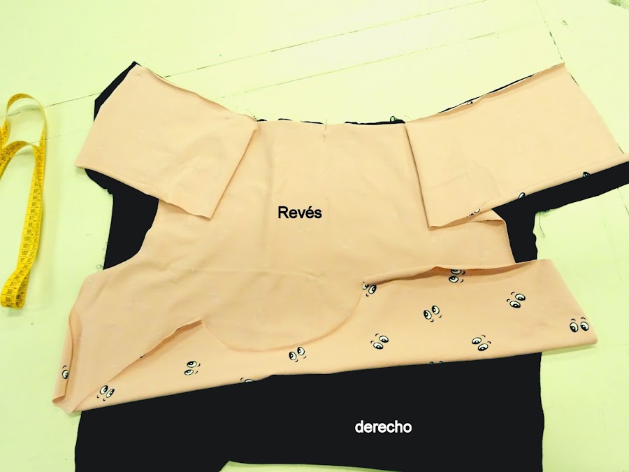 En la parte trasera he hecho un corte para continuar con el corte de color del delantero, me parecía mas chulo el símil de falda que hace el cambio de color del delantero. Además también temía que el color clarito del estampado de arriba pijameara.