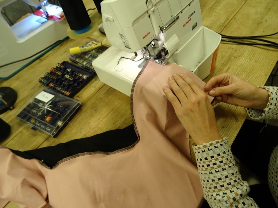 Una vez hemos cosido la cinta colocamos los forros de los bolsillos en los bordes de las aberturas, derecho con derecho sobre el delantero inferior y cosemos.
