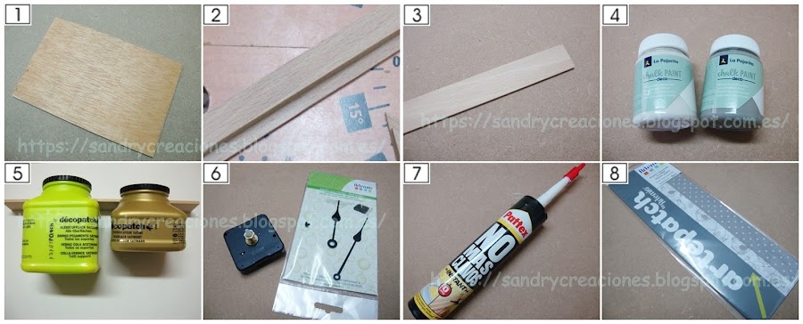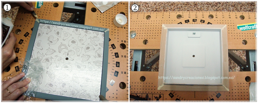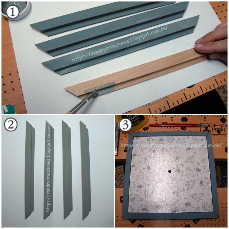 Paso 8. Realizar el marco del reloj. Para eso cogimos el listón que tiene el numero 2 en los materiales y cortamos cuatro trozos con las esquinas al bies para que se acoplen. Una vez que todas encajan más o menos bien, pintamos con dos capas de chalk paint color Vintage y una vez seca la pintura procedemos a pegar el marco. Fuimos pegando las piezas del marco una a una mientras las íbamos pegando a la lámina de madera del reloj.
