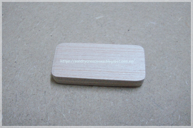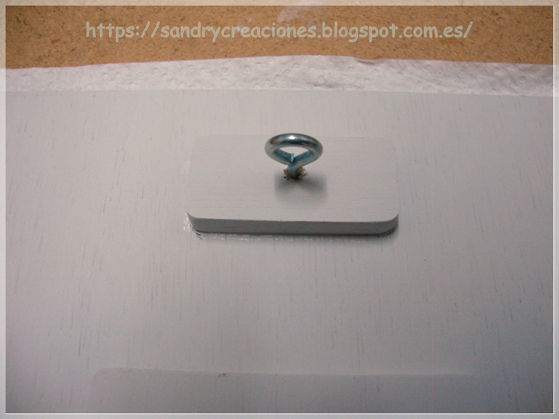 Paso 7. Realizar un pequeño trozo de madera dónde pondremos una hembrilla cerrada. Para poder colgar el cuadro queríamos poner una hembrilla cerrada, pero nos encontramos con un problema similar al del mecanismo del reloj (paso 2), y es que la lámina de madera del reloj era demasiado delgada para poder atornillar una hembrilla cerrada. Con lo cual cortamos dos trozos de lámina de madera de 4,5 x 2cm, los pegamos entre si y los pulimos bien.