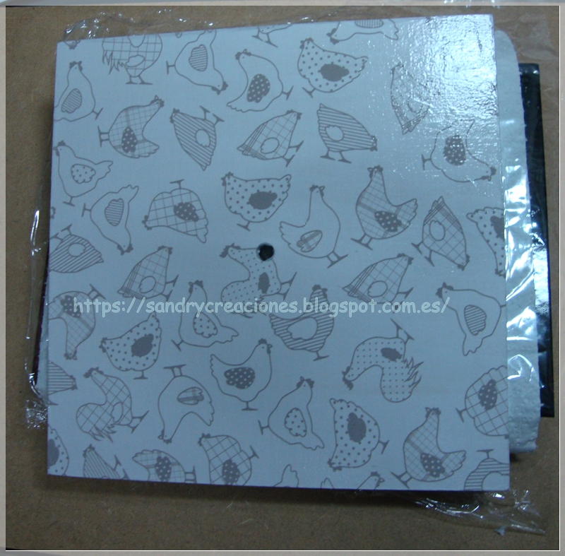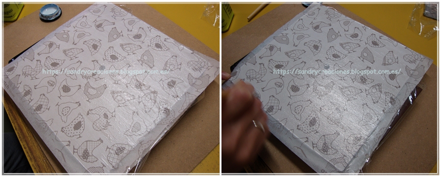 Paso 5. Aplicar papel con la técnica de decoupage. Cómo el reloj que queríamos hacer era para cocina escogimos un papel con motivos de gallinas que nos pareció muy bonito y de los colores que teníamos en mente para el reloj. Esta vez quisimos hacer el decoupage con una cola ya preparada par esta técnica, concretamente de la marca Decopatch. Es la primera vez que probamos este tipo de cola y nos gusta bastante, aunque a veces nos da más brillo del que querríamos (en el caso del reloj no nos importaba este aspecto) o se le ven demasiado las pinceladas, pero en lo que respecta a su uso va bien. De todas maneras, iremos indagando en otras marcas para ver cuál nos va mejor a nuestras necesidades y gustos. Pues bien, para hacerlo fuimos aplicando una capa de cola para decoupage en la parte delantera del reloj, que anteriormente habíamos pintado con chalk paint, y fuimos pegando el papel con la ayuda del pincel pasando otra vez una capa de cola para decoupage por encima con cuidado de que no se nos formaran arrugas ni burbujas. Una vez aplicado el papel dejamos secar.