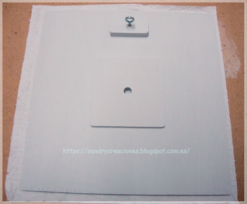 Paso 4. Lijar y pintar la lámina de madera por la parte delantera y la trasera. Una vez tenemos hecho el agujero procedemos a lijar bien toda la parte delantera y la trasera. Seguidamente pintamos con dos capas de chalk paint color Sal Ibiza la parte delantera del cuadrado de lámina de madera, que será la parte delantera del reloj, y la parte trasera del cuadrado que será la que irá de caras a la pared.
