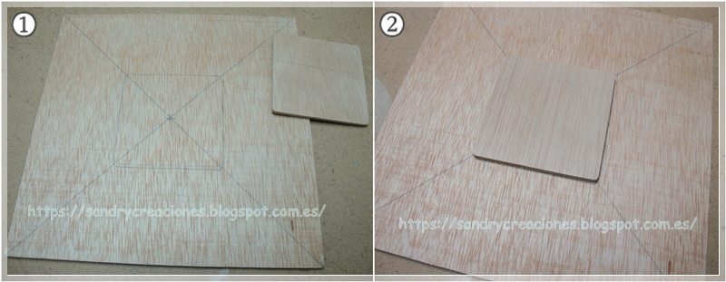 Paso 1. Cortar la lámina de madera de forma cuadrada en la medida que queramos. Con la ayuda de un lápiz y una regla dibujamos encima de la lámina de madera un cuadrado de la medida que necesitemos, en nuestro caso nos guiamos por las agujas que queríamos poner en el reloj, la más larga tenia una longitud de unos 9,5 cm, por tanto, necesitábamos como minino un cuadrado de 19 cm de lado para que esa manecilla no sobresaliese de esa superficie. Como no nos gustaba que la manecilla larga quedara tan justa al borde finalmente decidimos hacer la superficie del reloj con un cuadrado de 20,5 cm de lado.