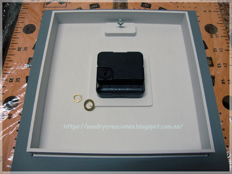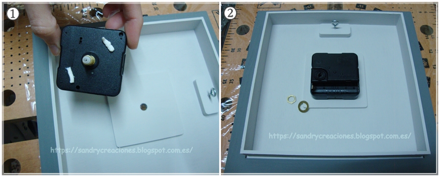 Paso 10. Poner el mecanismo del reloj y las agujas. Colocamos el mecanismo del reloj por el agujero que hicimos en la parte central, el mecanismo ya trae una arandela y un tornillo hembra para fijarlo pero para darle una mejor sujeción nosotros lo pegamos a la parte trasera del reloj con adhesivo de montaje.