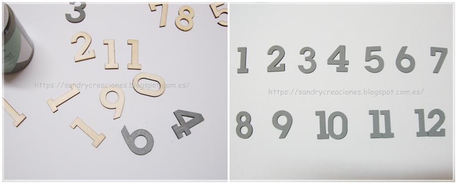 Paso 11. Poner los números. Primero realizamos los números, para ello compramos números de madera que ya vienen pre-cortados y con adhesivo incluido, ya que vimos que tenían una altura aproximada de 3 cm, anchura aproximada de entre 2 - 2,3 cm y grosor aproximado de 1 mm, por tanto nos venían perfectos para nuestro reloj. Los pintamos con dos capas de chalk paint de color Vintage para que se destacaran bastante del fondo del reloj.
