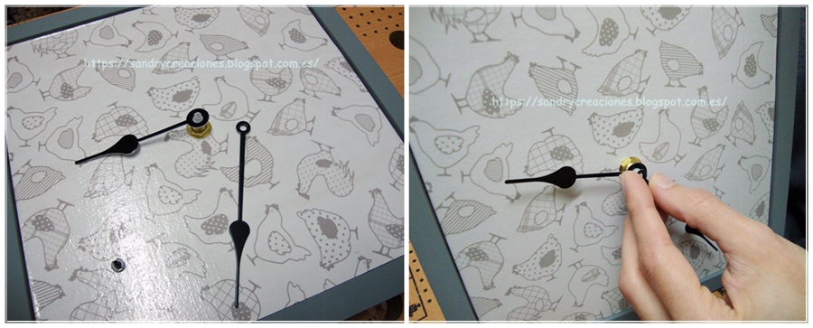 Una vez fijado el mecanismo, ponemos primero la manecilla pequeña y seguidamente la manecilla grande y cerramos el conjunto con un pequeño tapón que traen consigo el conjunto de las dos manecillas.
