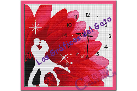 Bonito gráfico de un reloj con una pareja y una flor de fondo...