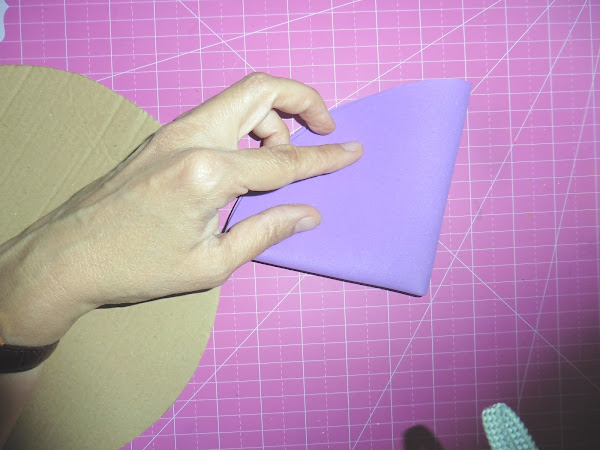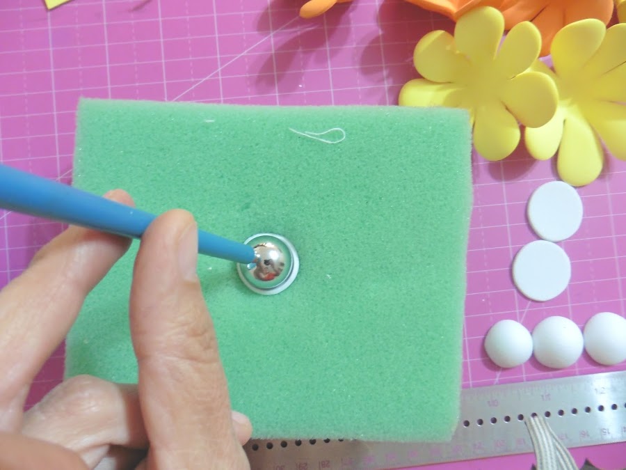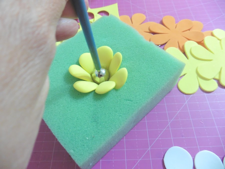 24. Con un bolillo, colocamos la florecita sobre una esponja y damos forma, observa la foto.