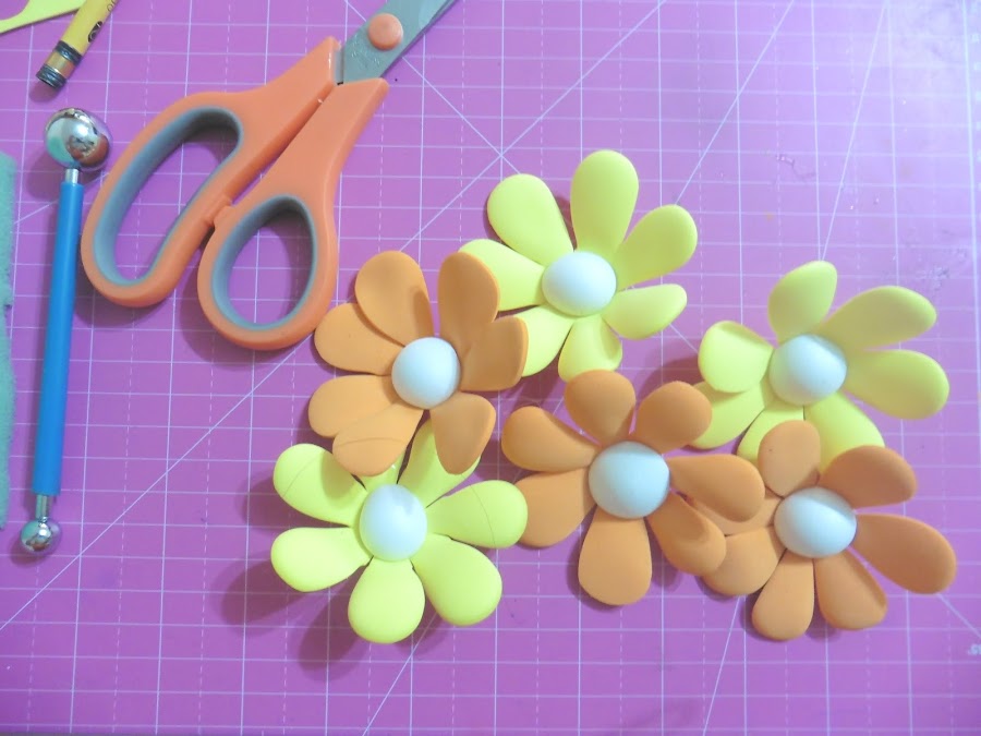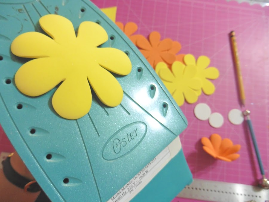 22. Después de armado nuestro reloj, vamos a decorarlo para ello realizamos florecitas naranjas y amarillas y sus centro en micrporoso blanco.
