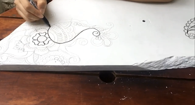 Cuando ya tenemos lista la tabla, pintada a nuestro gusto, preferiblemente en color claro, vamos a plasmar sobre ella el diseño deseado, en mi caso dibuje un zentangle art y arabescos.