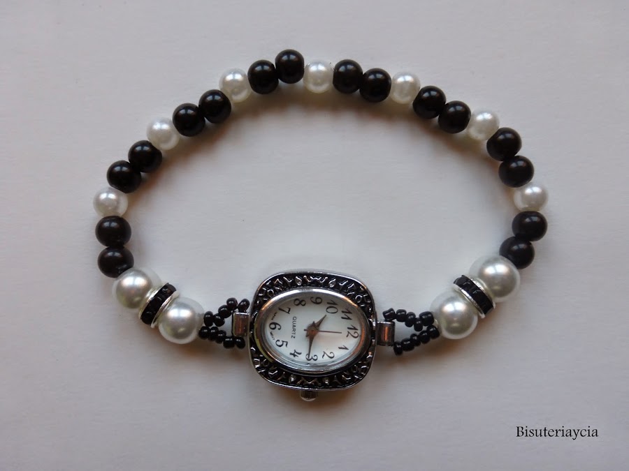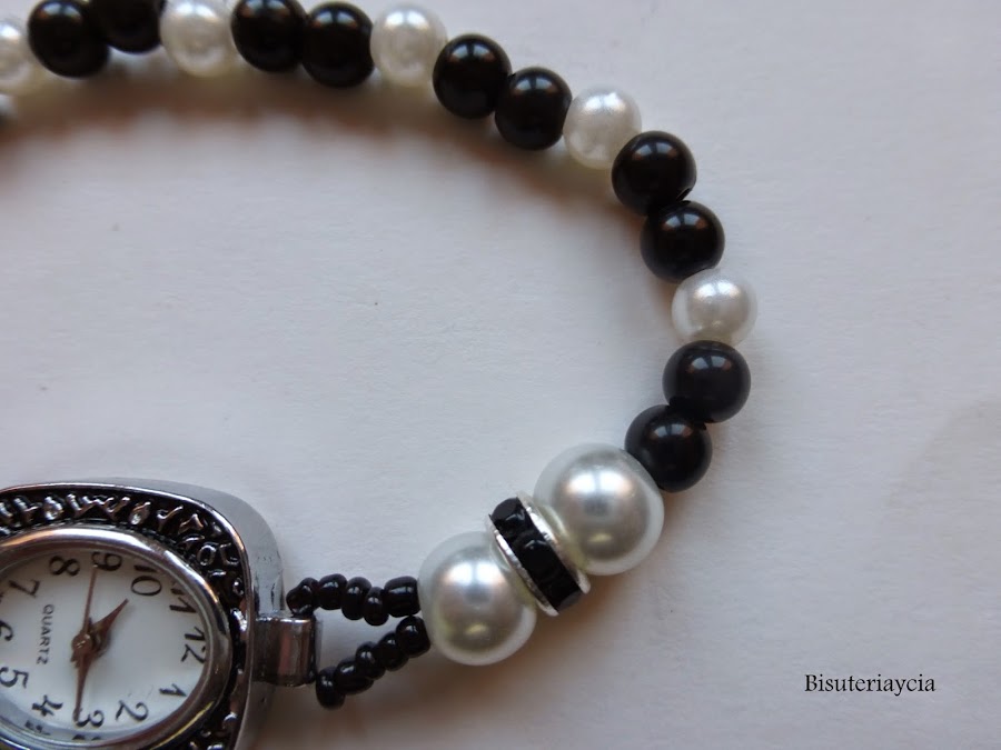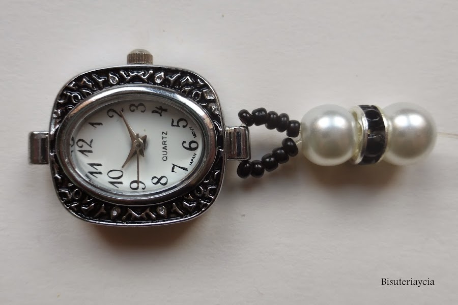 Lo siguiente que hice fue enfilar perlas mas pequeñas negras y blancas.
