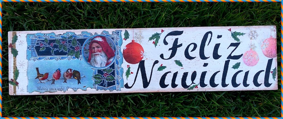 Esta realizado en una tablilla de una caja de frutas. Pintada con acrílica blanca.Realicé el decoupage con imágenes impresas, y también utilicé servilleta.