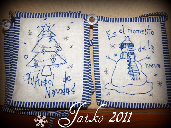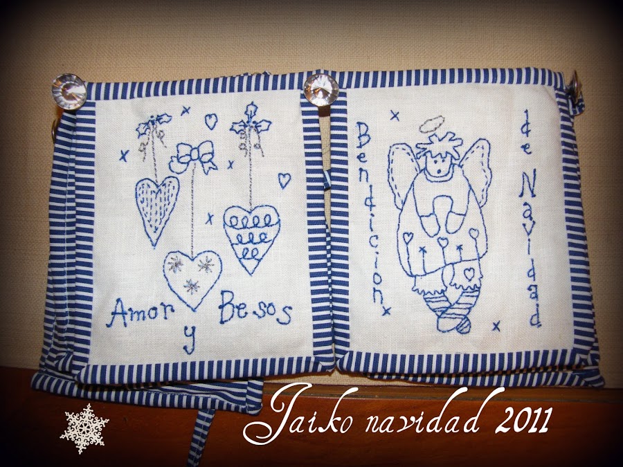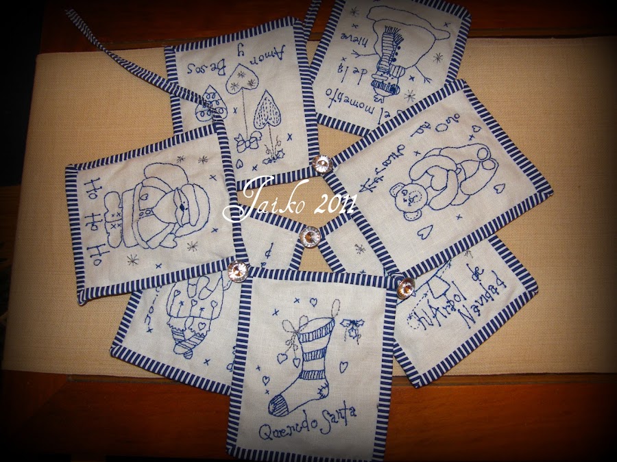 El toque personal ha sido iniciativa de Nieves, bordar los textos en castellano puro y duro, si es que la Ñ nos tira más que nada!! jjejjejejeje.