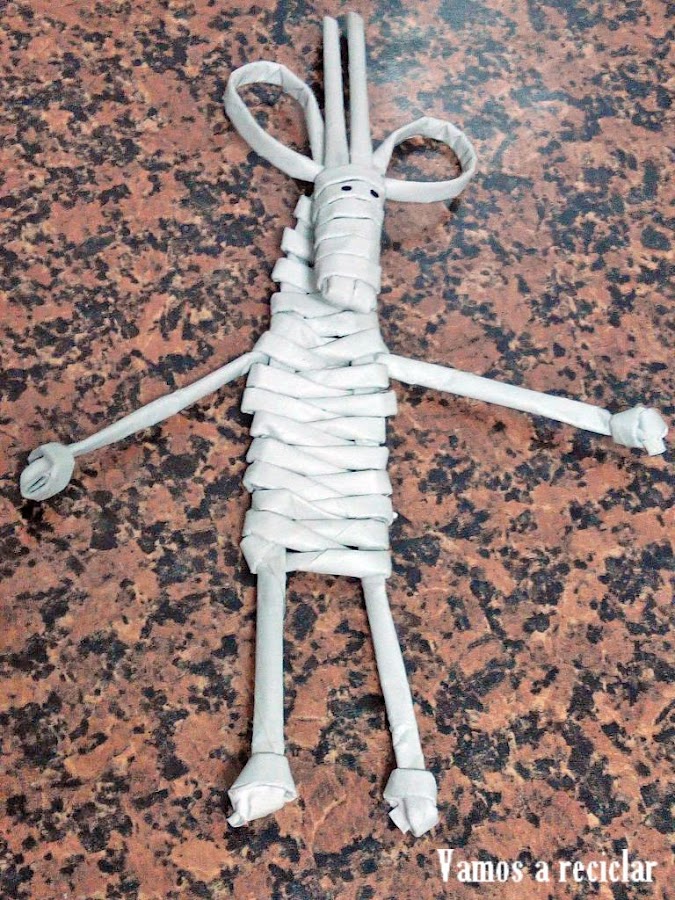 Hacemos un nudo en el extremos de los brazos y las piernas, intentando que queden del mismo tamaño y podemos echar una gota de cola para que no se deshagan.