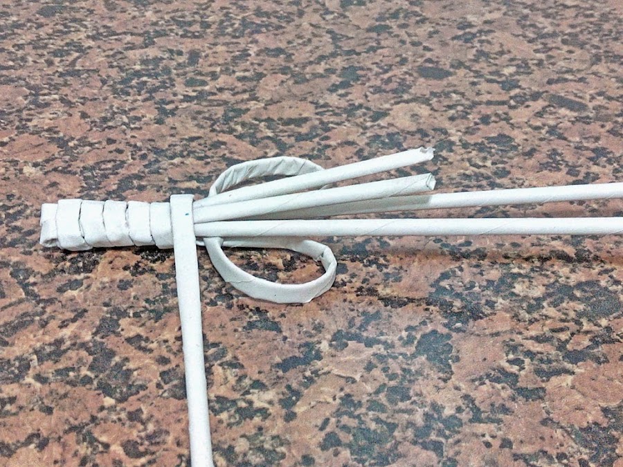 Cuando nos parezca que ya es bastante grande pasamos el extremo del rollito hacia atrás y lo escondemos entre el tejido, echando un poco de cola y cortando el sobrante.