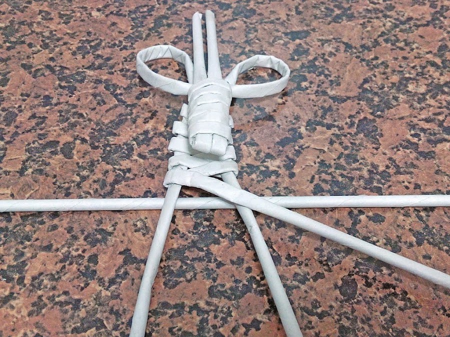 Doblamos otro rollito a la mitad y lo introducimos en medio de los que acabamos de doblar hacia arriba: este rollito será la base del cuerpo.