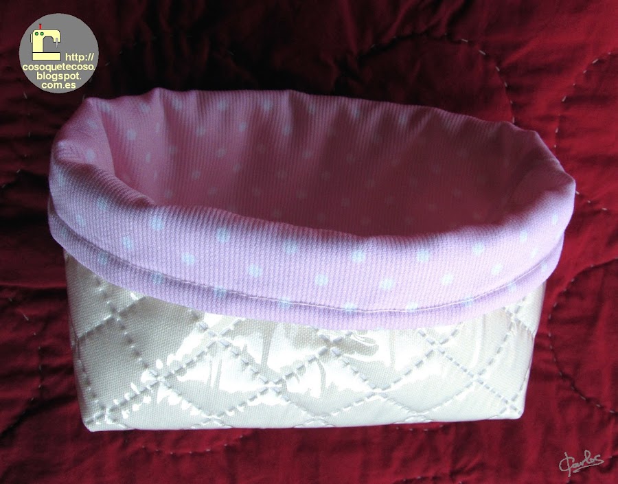 Hice otra con la misma tela plastificada pero con la loneta de lunares en tonos tierra, uff, tampoco es lo que busco. Por cierto, la he debido de regalar porque no la he encontrado. Que desastre!!