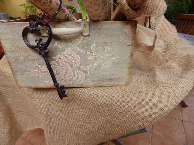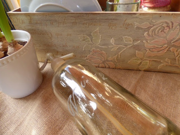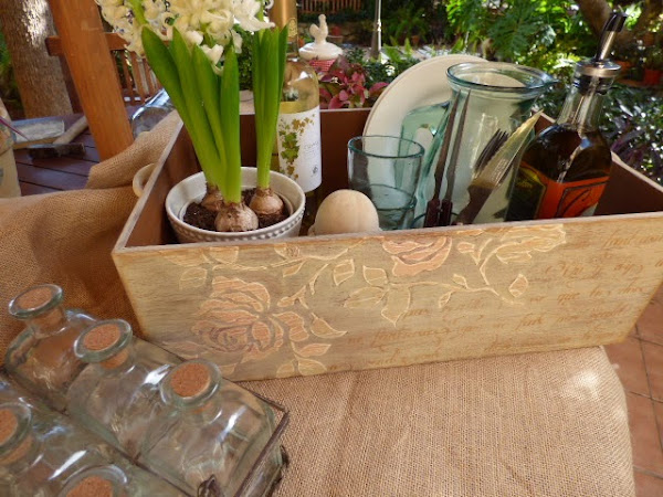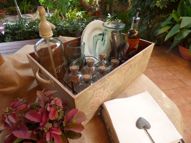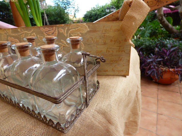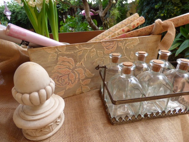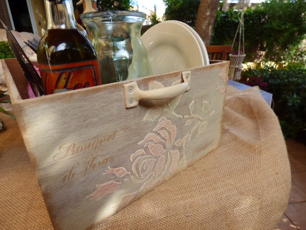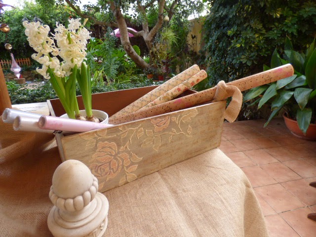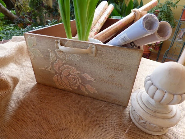 Y empecé a hacer cábalas....¿en vertical, en horizontal, en posición normal de caja? Con esto quiero decir que empecé a decorarla sin tener ni idea de para qué la iba a utilizar. Al principio pensé porta-macetas, pero no.....