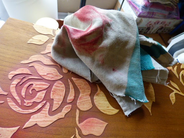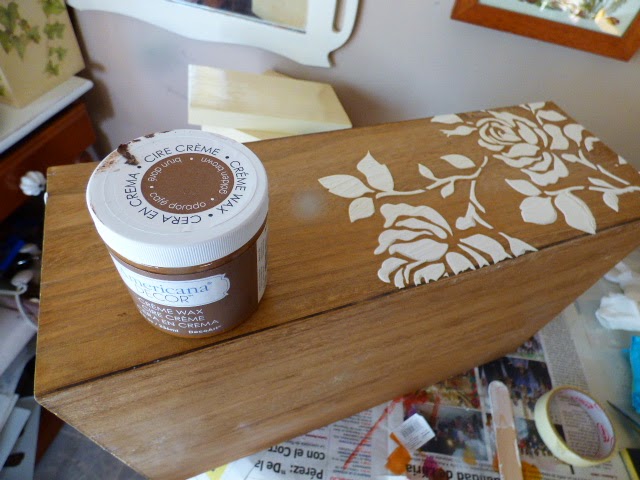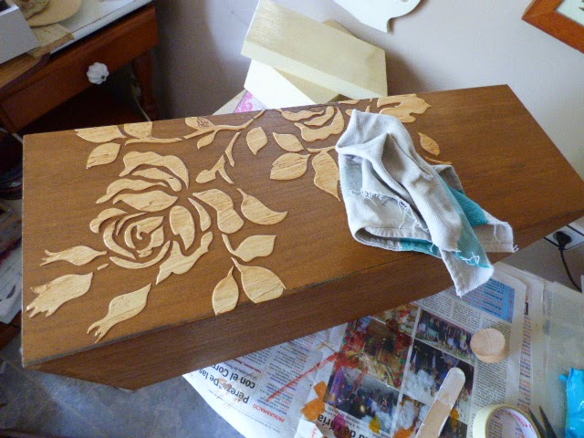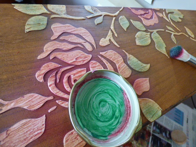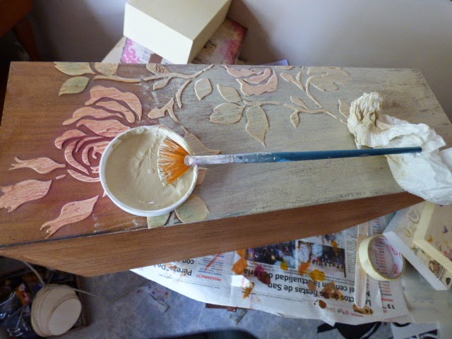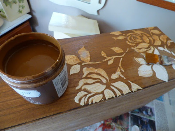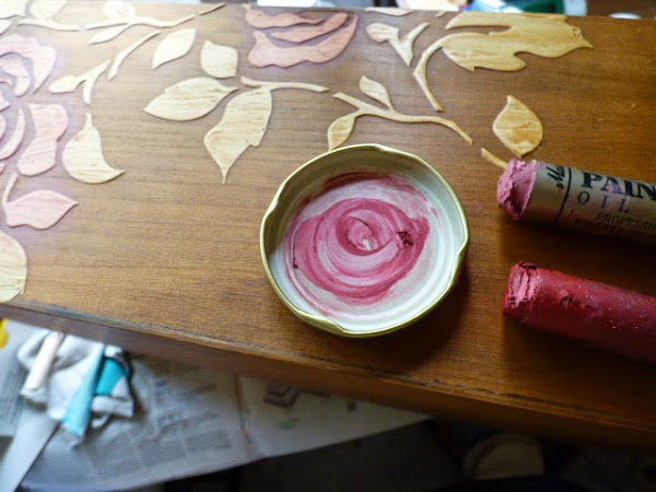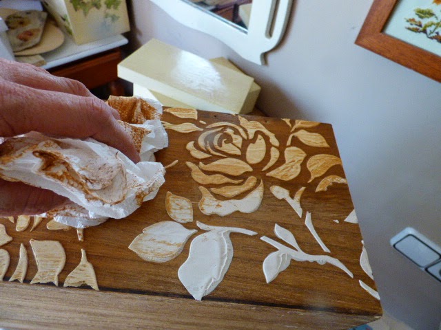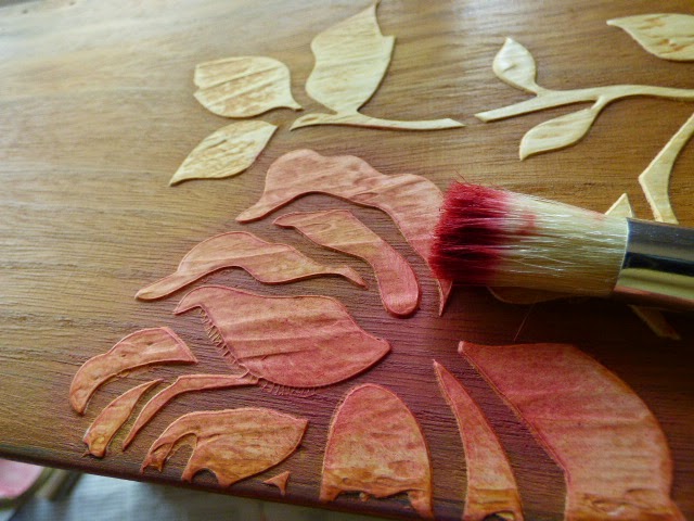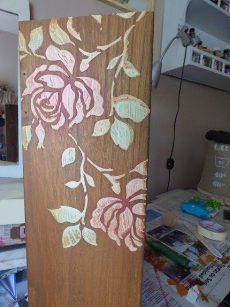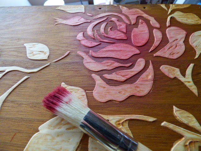 con el pincel fuí dando cera a los pétalos de las rosas...y a la zona de la madera entre pétalo y pétalo. Con movimientos circulares todo vá cogiendo color.....