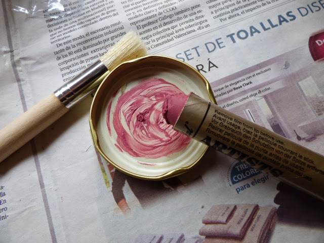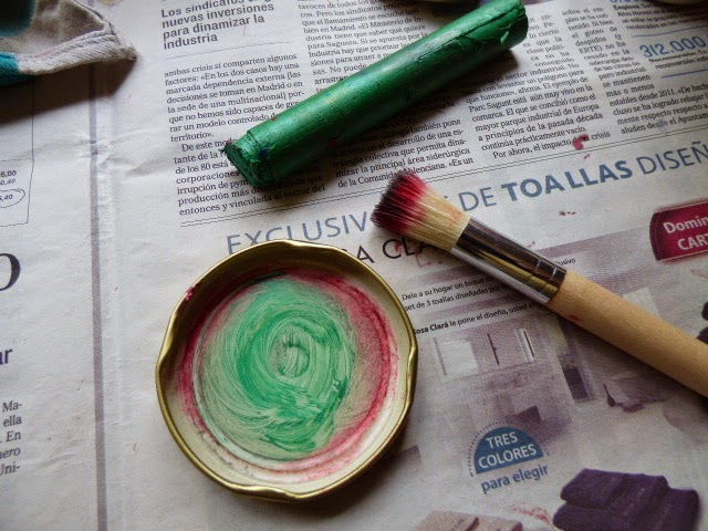a la cera se le corta un poquito la pelicula gruesa que tiene en la punta, luego se restriega un poco en un platito de plástico o cualquier otra cosa. Con el pincel de estarcir se vá cogiendo cera y extendiendo dónde se quiere utilizar