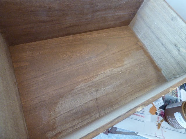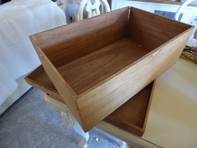 Digo un cajón porque el tamaño de esta caja se las trae. Es súper grande y ya veis que estaba algo perjudicada. La tapa tiene un raja que la atraviesa y seguramente la convertiré en bandeja....de momento lo que he renovado es el resto de la caja...o sea la parte inferior