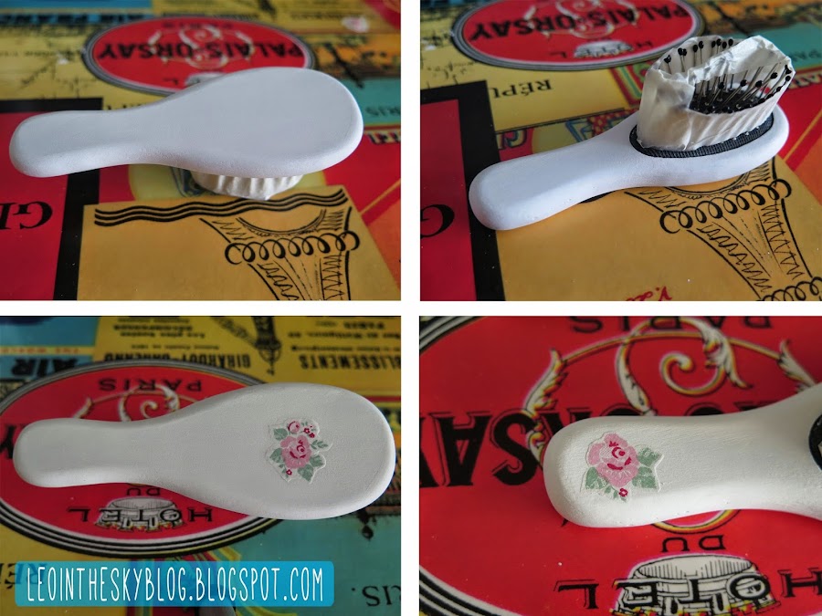 Una vez seca la pintura, recorté un par de rositas de una servilleta de Ikea y las pegué al cepillo, una en el mango y otra en la parte posterior del mismo con cola blanca para manualidades. Para que no se me hicieran muchas arrugas puse un trocito de papel de horno sobre la rosa y presioné con el dedo.