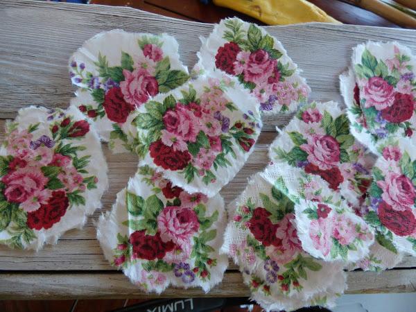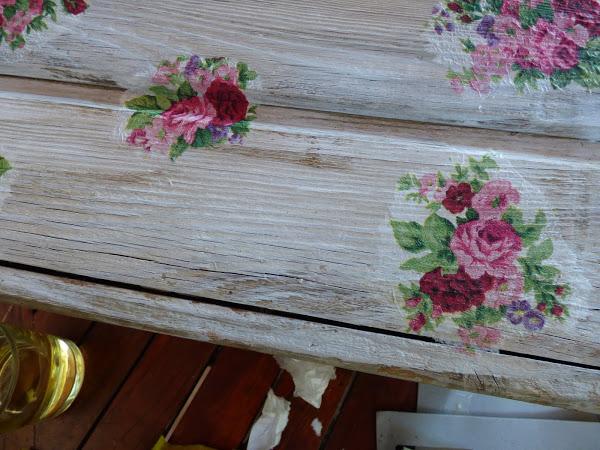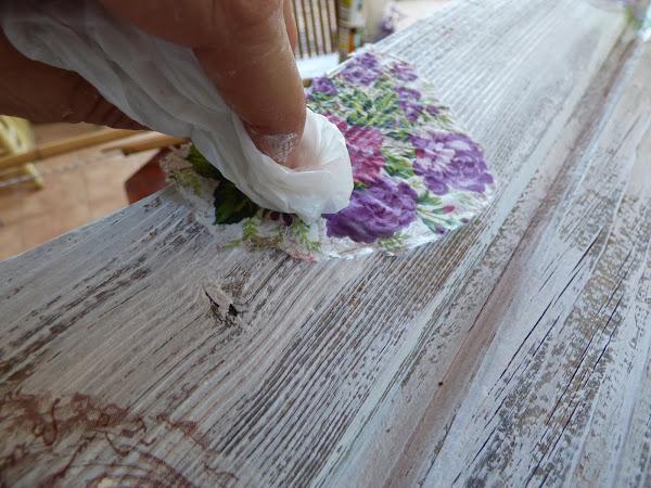 Una vez recortados los motivos que se quieren poner, se extiende en el lugar elegido, una fina capa de cola disuelta en un pelin de agua. Se deja caer el recorte (quitándole las 2 capas blancas) y se pasa un plástico por encima....del centro a los extremos, presionando muy suavemente, para eliminar las burbujas que se hacen. Luego se dá por encima otra pasadita de cola. Cuando se seca, ni una arruga queda¡