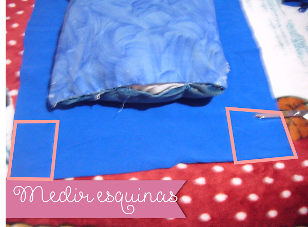 Ahora ponemos el cojín en el centro de la pieza de tela y marcamos unos cuadrados en las esquinas de la playera tomando como referencia las esquinas del cojín.