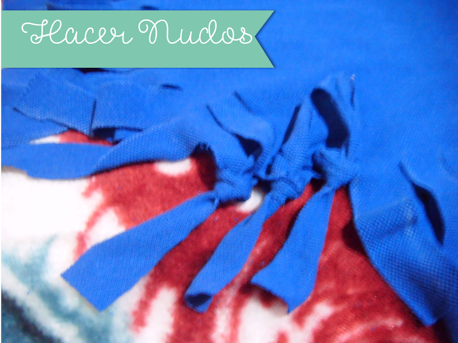 Vamos a comenzar a hacer nudos en los flequillos para unir unos con otros e ir uniendo la pieza de tela de arriba con la de abajo.