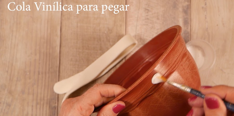 Estiro un trozo de porcelana que quepa mi objeto, presiono para que tome la forma y recorto y lo pego a la maceta con cola vinílica.