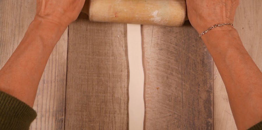 Estiro un trozo de ella con las manos y luego aplasto con un palo de amasar de forma pareja haciendo un tira.