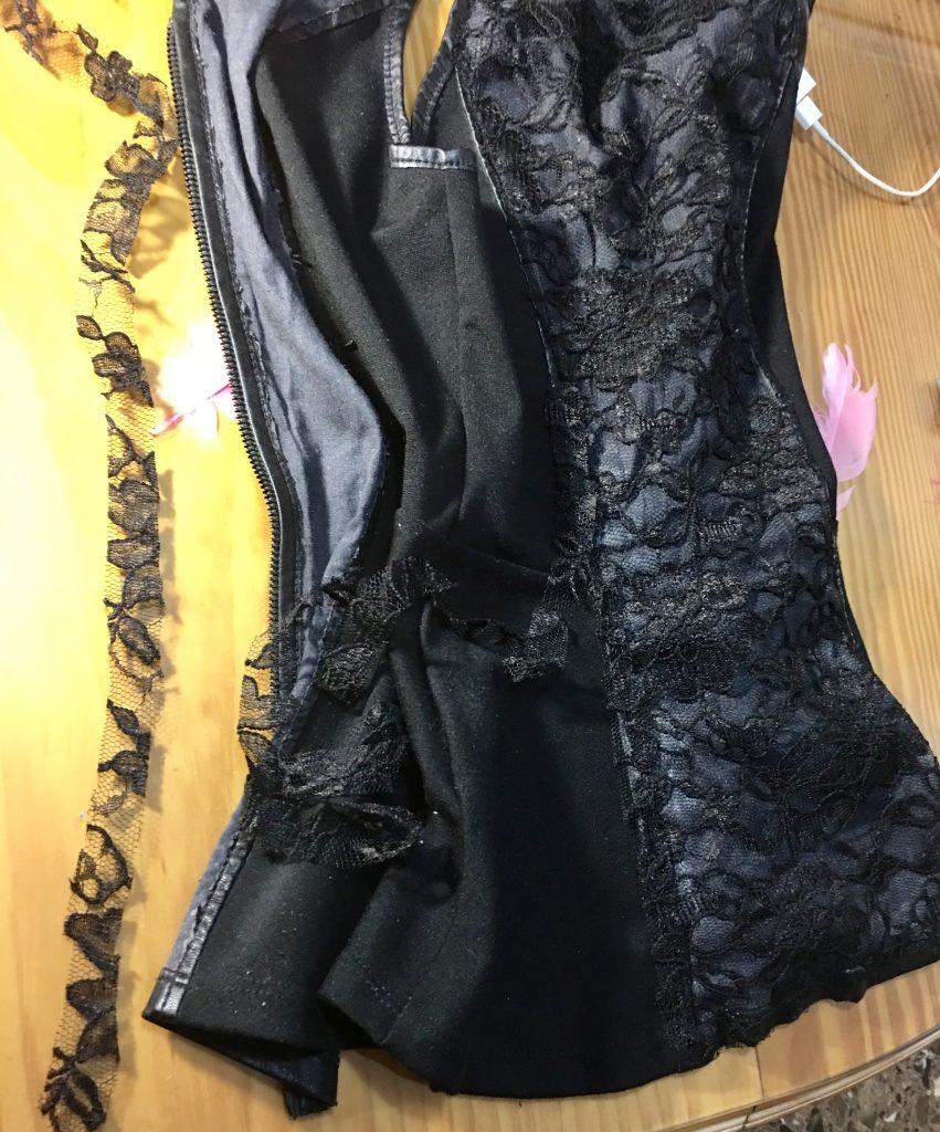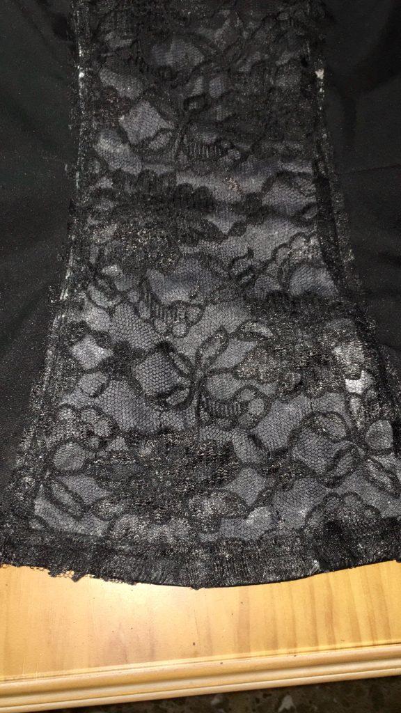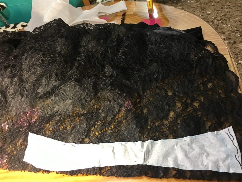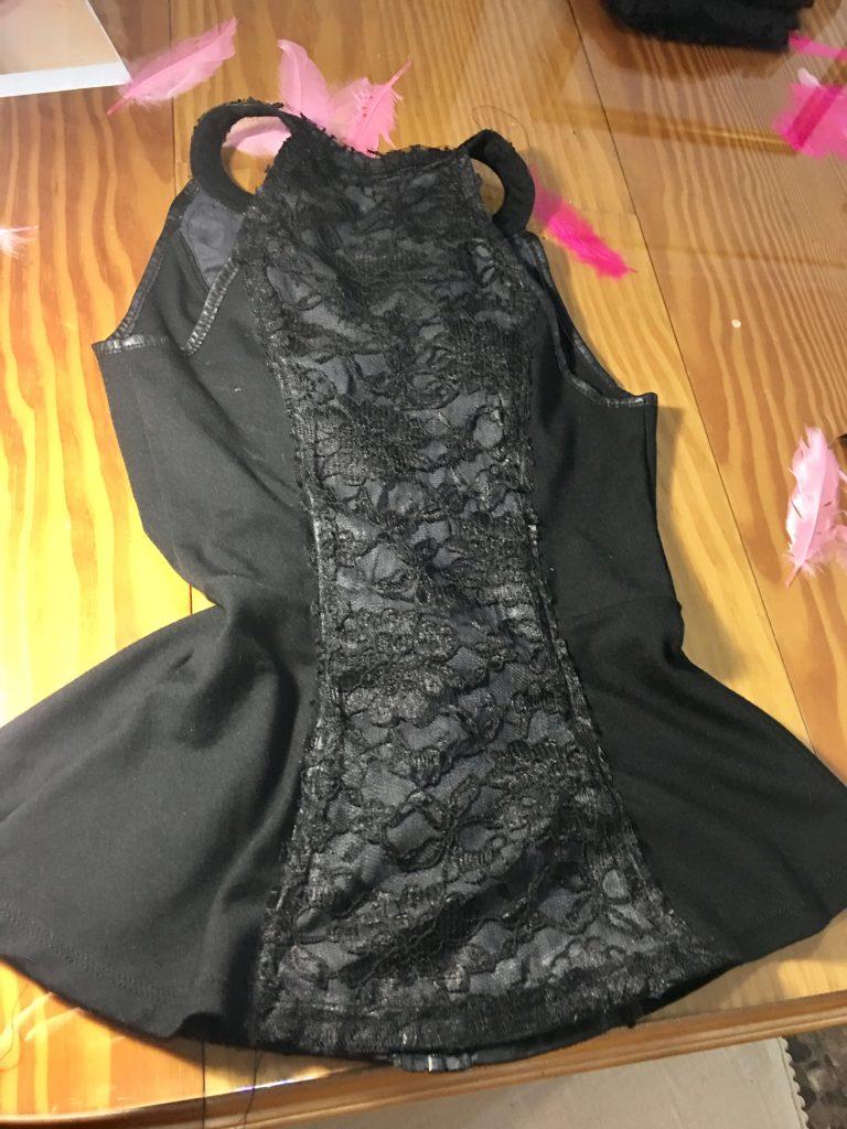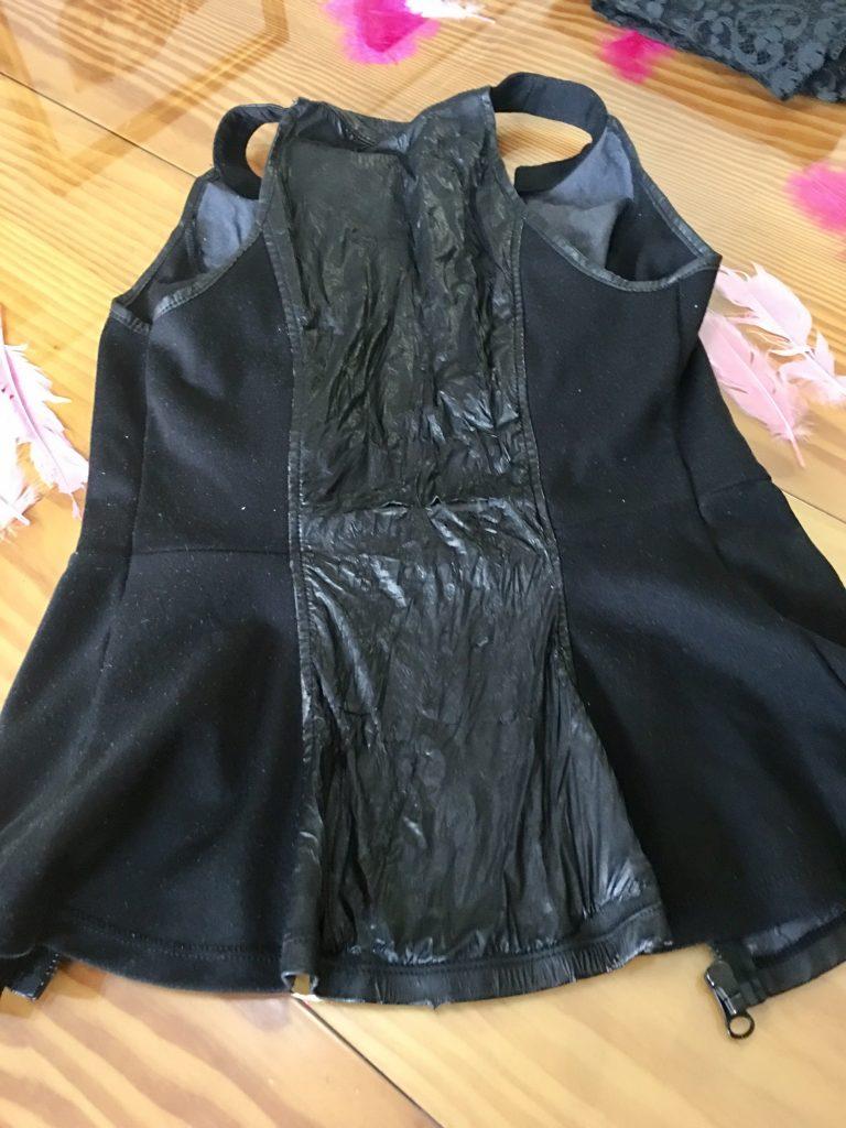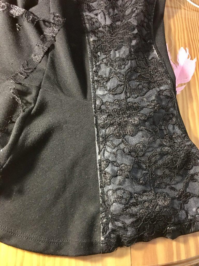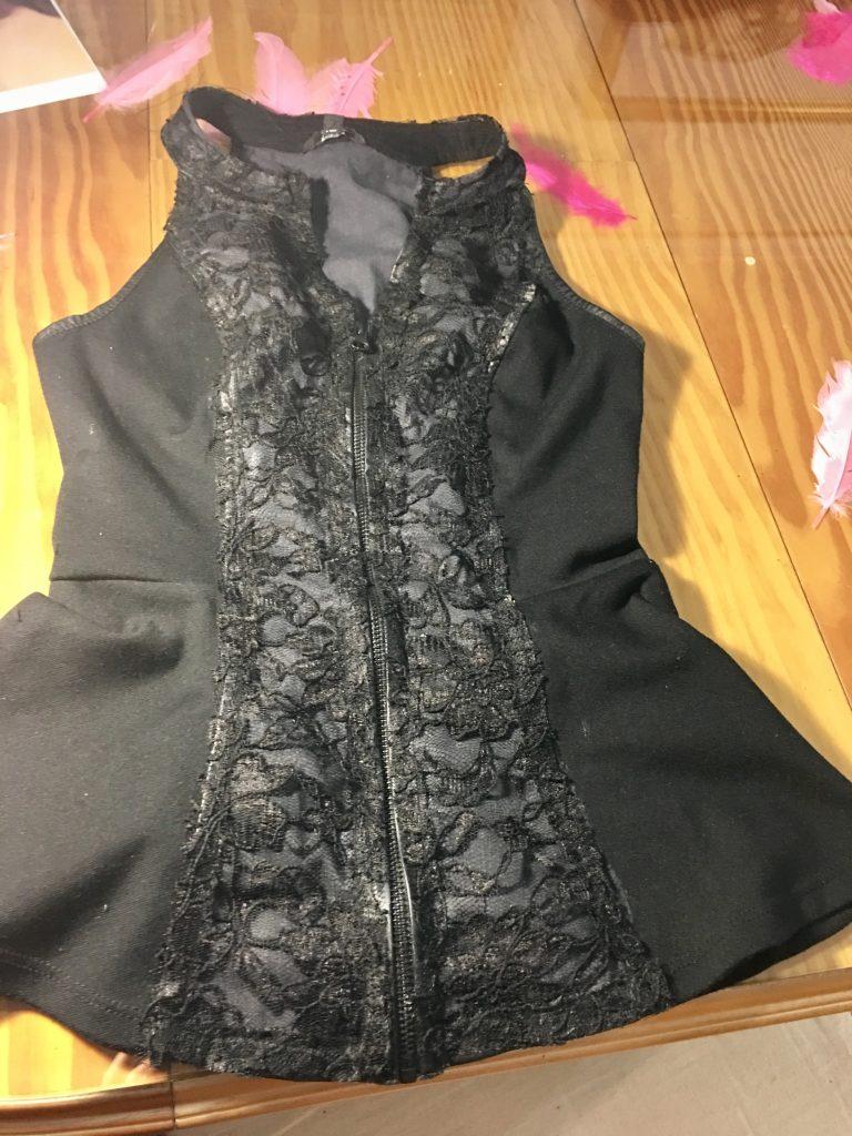 Imaginaros la decepción al ver mi top estropeado. Cuando me pasan estas cosas que a veces me suelen pasar por tener prisa y no fijarme, me quedo tan plof, que mi cabeza va a mil por hora hasta encontrar una solución, en este caso me ha venido a la cabeza un retal de encaje negro que tengo en casa y no utilizaba nunca. La parte del cuero sintético dañada la he podido disimular con la tela de encaje y eso es lo que he hecho.En principio quería cortar la parte del cuero sintético y coser el encaje directamente a las otras piezas del top, pero el encaje es tela que no cubre y la idea que no cubriera no me gustaba. Así que he decidido pelar toda la parte vinílica del cuero sintético, quedándome con el algodón que hay bajo. Si os fijáis el cuero sintético es un compuesto químico vinílico que recubre una tela. Total ya tenía el trabajo adelantado la lavadora había despegado y arrugado parte del vinilo, aunque tengo que reconocer que el trabajo pesado ha sido arrancar toda la parte vinílica y dejar el algodón limpio.