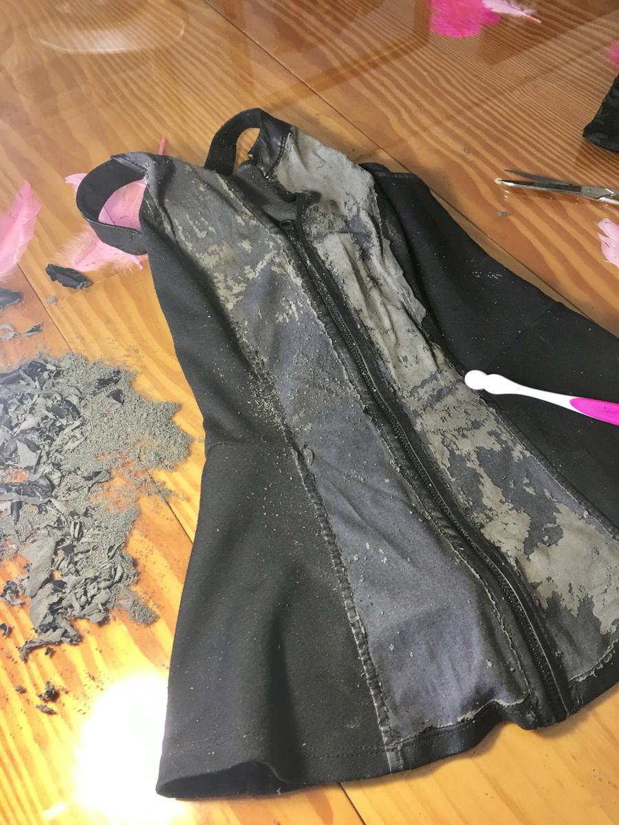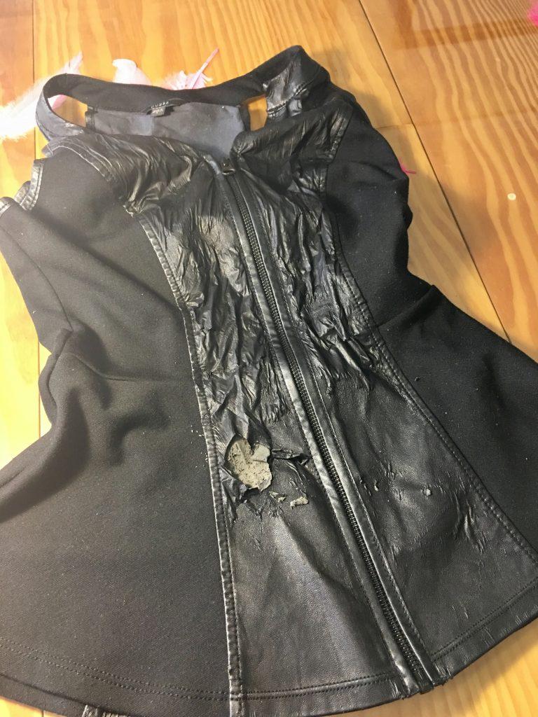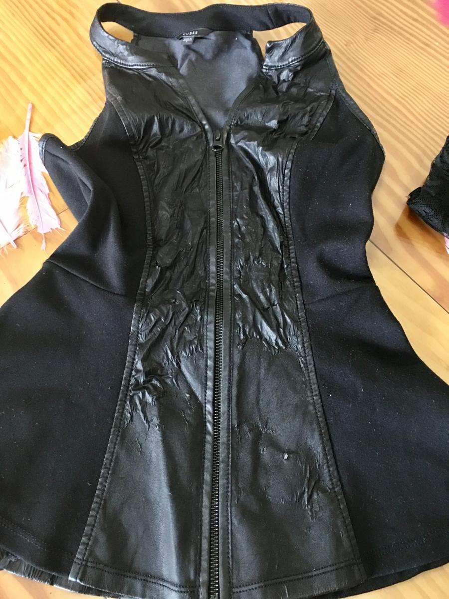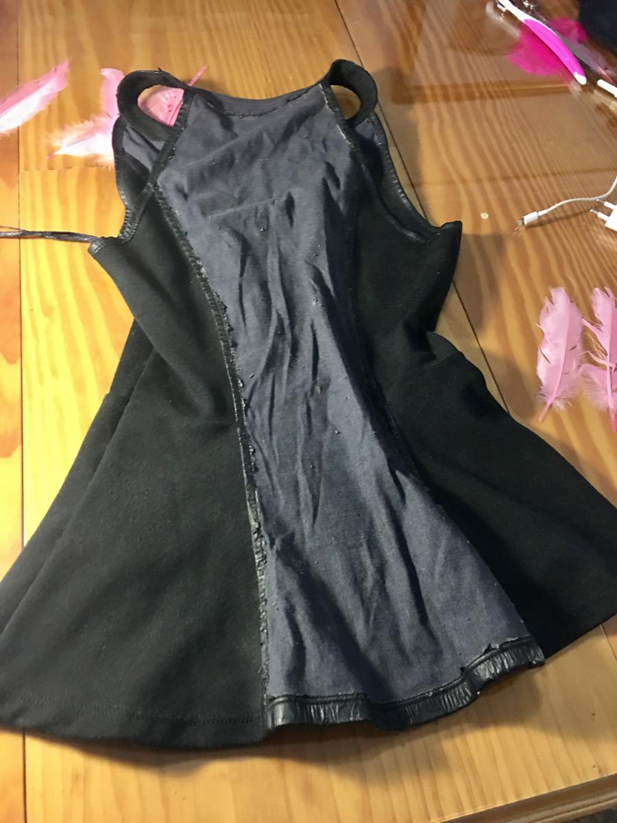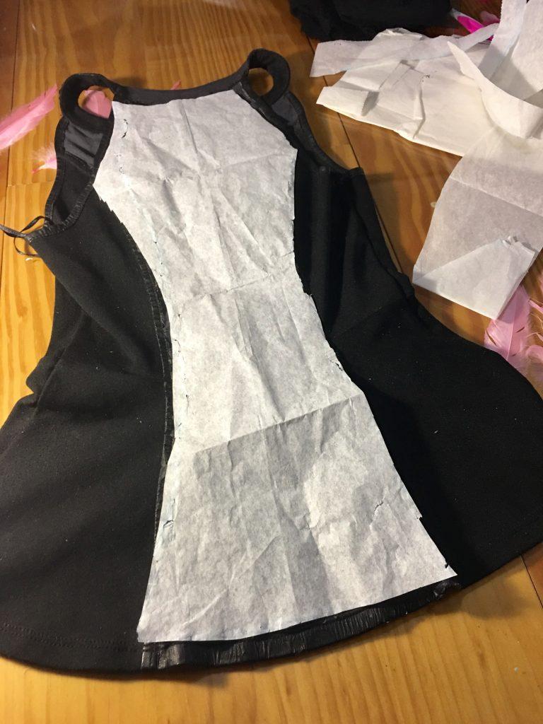 Imaginaros la decepción al ver mi top estropeado. Cuando me pasan estas cosas que a veces me suelen pasar por tener prisa y no fijarme, me quedo tan plof, que mi cabeza va a mil por hora hasta encontrar una solución, en este caso me ha venido a la cabeza un retal de encaje negro que tengo en casa y no utilizaba nunca. La parte del cuero sintético dañada la he podido disimular con la tela de encaje y eso es lo que he hecho.En principio quería cortar la parte del cuero sintético y coser el encaje directamente a las otras piezas del top, pero el encaje es tela que no cubre y la idea que no cubriera no me gustaba. Así que he decidido pelar toda la parte vinílica del cuero sintético, quedándome con el algodón que hay bajo. Si os fijáis el cuero sintético es un compuesto químico vinílico que recubre una tela. Total ya tenía el trabajo adelantado la lavadora había despegado y arrugado parte del vinilo, aunque tengo que reconocer que el trabajo pesado ha sido arrancar toda la parte vinílica y dejar el algodón limpio.