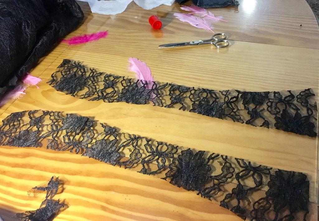 Una vez limpias todas las piezas donde antes estaba el cuero sintético, he sacado plantillas con papel, con las plantillas he recortado la tela de encaje y he pegado los retales de encaje cortados a sus piezas correspondientes como si se tratara de un puzzle, siempre uso para pegar un pegamento de barra que es para tela, luego paso la aguja de la máquina por encima y no pasa nada, esto me facilita mucho el trabajo, pues al ser una tela que no se deshilacha, no hace falta hacer orilla. Si la orilla no queda completamente a mi gusto, ya invento otras cosas, en este caso he cortado tiritas finas del mismo encaje y las he puesto encima de todos los bordes de dichos retales.