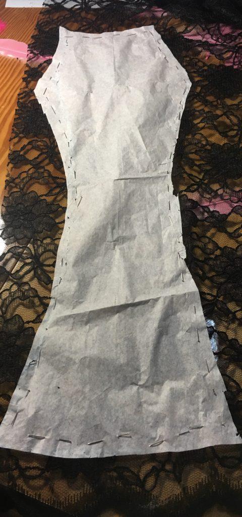La plantilla de papel sobre la tela de encaje con agujas sujeta y recortamos