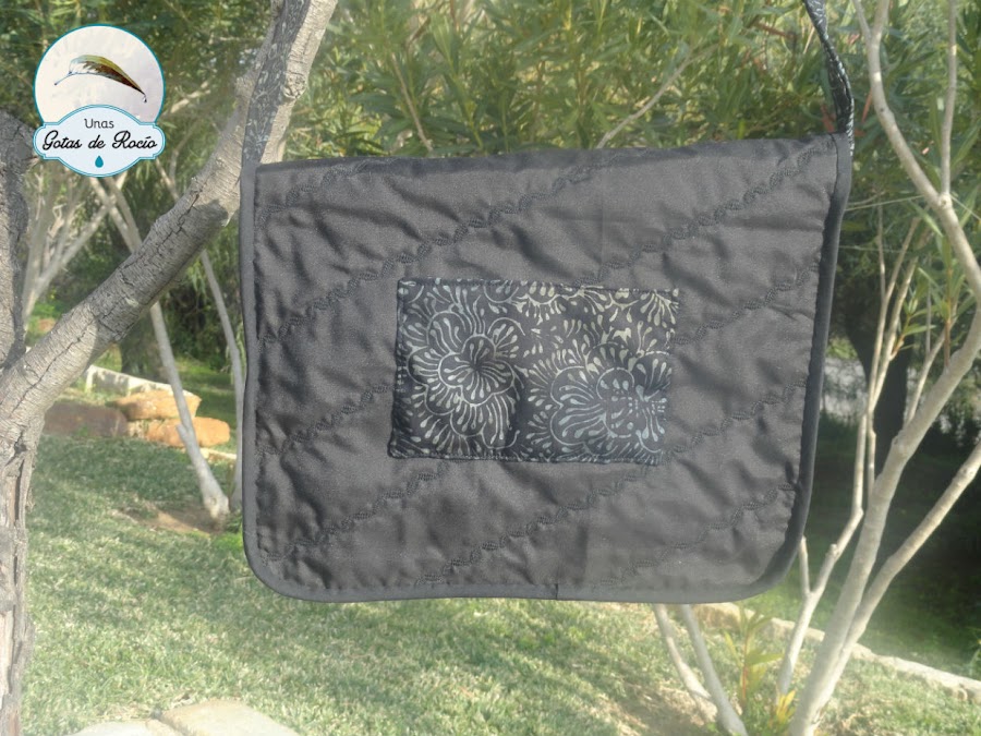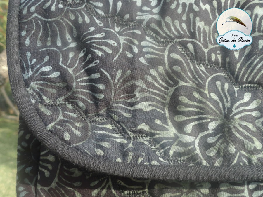 Con fondo negro, unas flores en grises haciendo aguas forman un elegante estampado. Forro y bies negro para rematar, un bolsillo en su interior, cierre magnético y unas puntadas decorativas para acolchar.