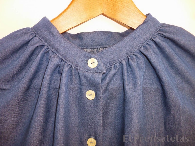 Tenía intención de alargar las mangas para que me llegaran a la muñeca, y realmente necesitaba muy pocos centimetros pero, por la tela que tenía, no ha podido ser. La primera vez me hice una talla 40 pero me parecía muy ancha de hombros y de cuerpo y esta vez me he cosido la 38 y me queda mejor. Es un patrón que aunque sencillo es original ¿no?, con el cuello mao y el fruncido: