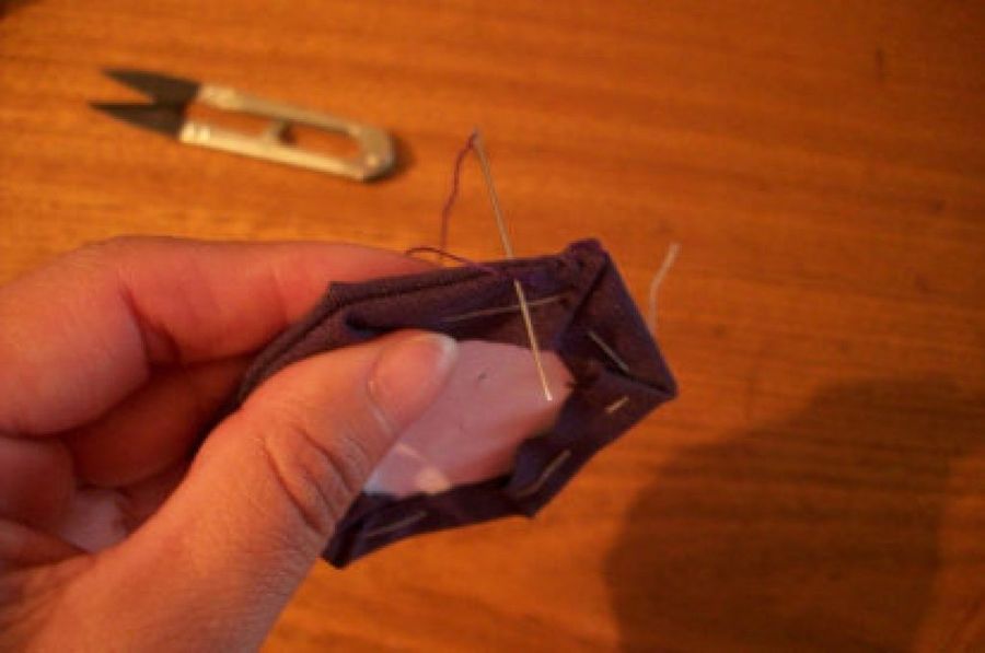 4. Y cosió los dos cuadrados que le habían quedado como si fuera un cojín en pequeño, dejó un lado sin coser para meter el relleno, y después le cosió.