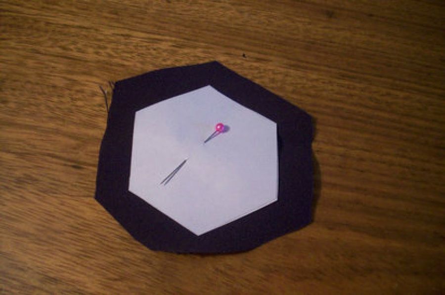 3. Cosemos la tela al papel doblándola hacia adentro, ajustándola bien a la plantilla para que queda bien la forma hexagonal. Así hacemos con varios hexágonos.