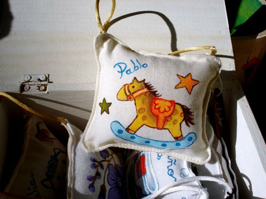 Almadecora transfiere bellos dibujos a las telas con ayuda de una impresora. Después plancha la bolsa y la rellena con algodón empapado en esencia de violetas.