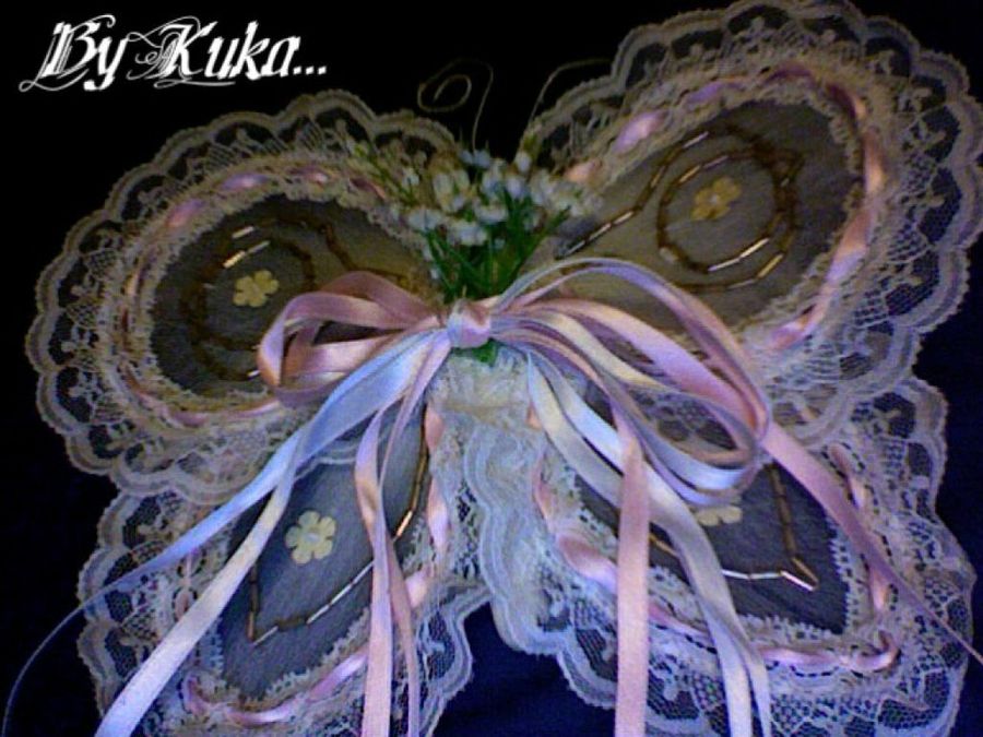 Delfora recibió este bello regalo, y lo compartió en el foro preguntando de paso cómo estaban hechas las alas. La sacó de dudas Vivebien: se trata del papel tisú. “Lo venden en tiendas de manualidades, los hay de muchísimos colores y estampados, que son preciosos, y además se trabajan súper bien”.