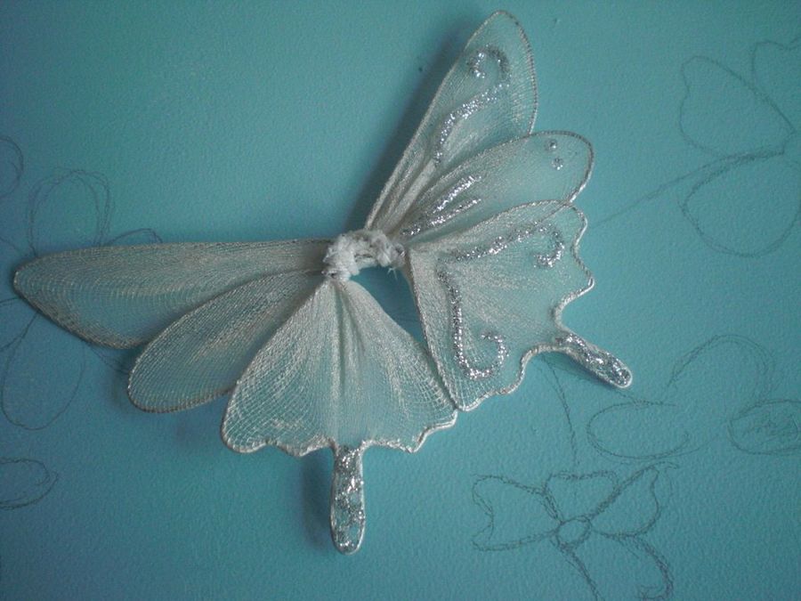 Dorthy asegura que es fácil crear las mariposas. Tiene un molde de madera para dar forma al alambre de las alas, así puede hacerlas idénticas. Dorthy explica que en la parte central podemos entrelazar el alambre o darle un punto de soldadura; luego forramos la estructura con media velada de colores, y finalmente se cose con aguja e hilo. El cuerpo se hace aparte, rellenándolo de algodón siliconado, o ensartando perlas de diferentes tamaños en un alambre, adornándolas con bordeadores y pedrería.