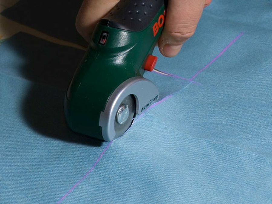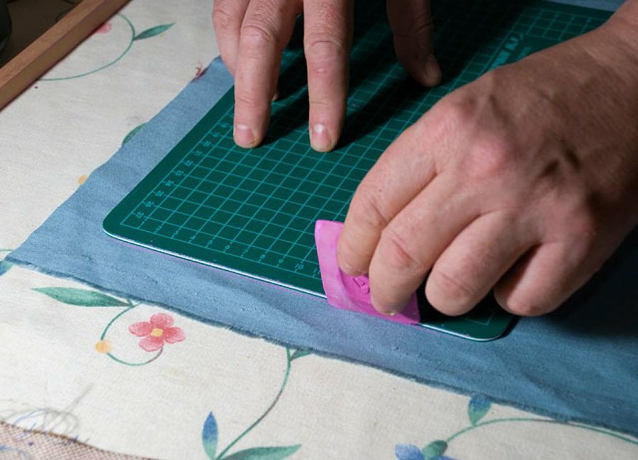 Doblamos la tela, y con la herramienta de corte sacamos a la vez cómodamente las dos piezas, que de esa forma serán idénticas.