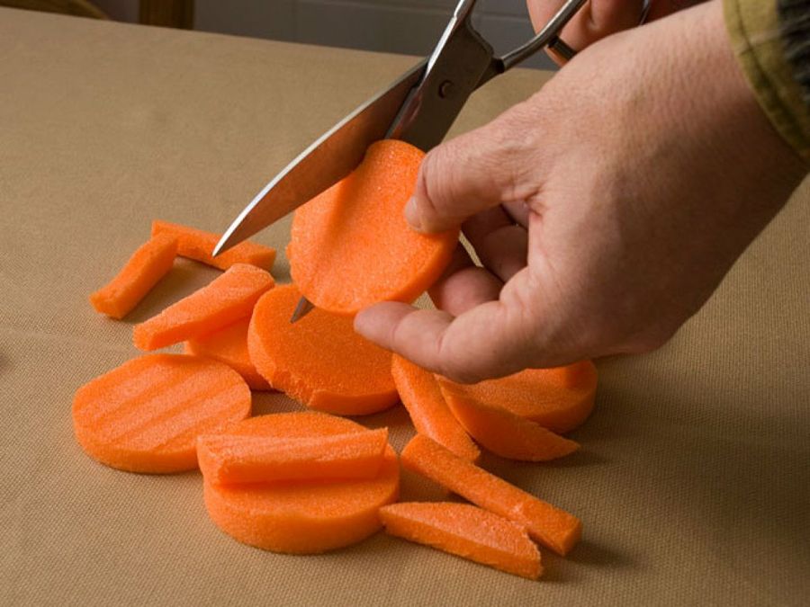 La tarea es limpia, sencilla, y podemos realizarla con los utensilios normales de la casa. Cogemos las tijeras de cocina para cortar las rodajas del flotador en trozos del tamaño de las patatas fritas.