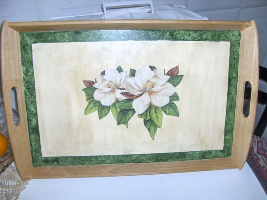 Arilo nos demuestra que las bandejas se prestan muy bien a la técnica del decoupage.