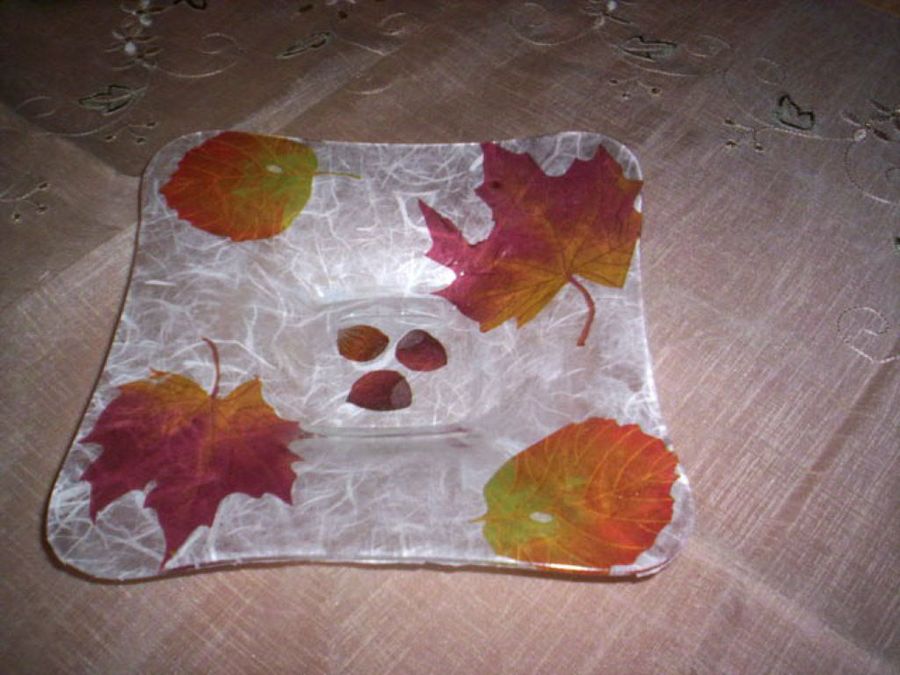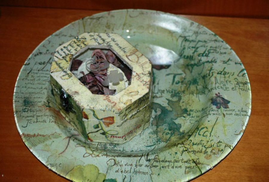 Gemut, otra experta en el decoupage, demuestra su habilidad con un precioso plato.
